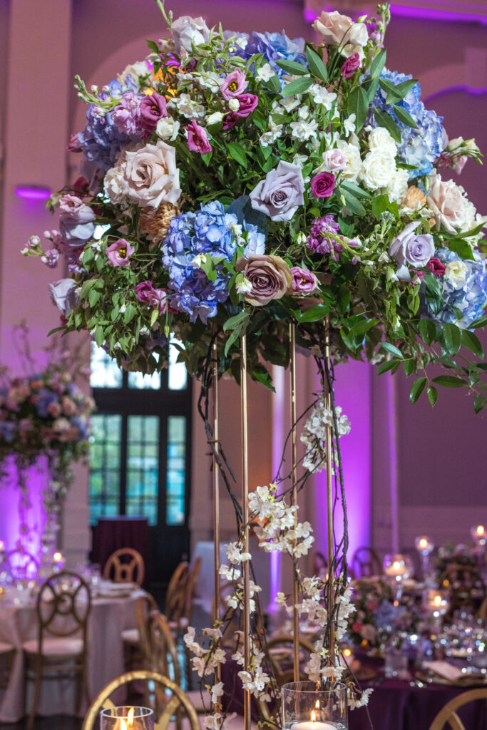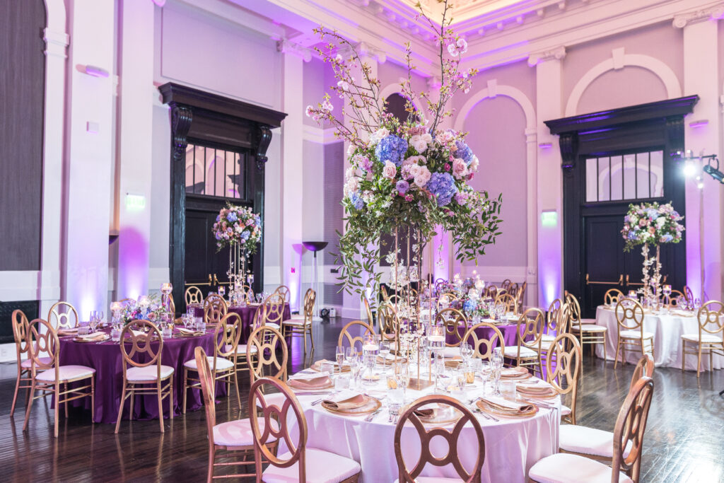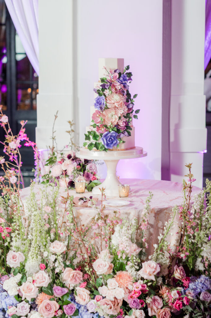 The dinner reception flowed seamlessly with soft pink drapery and lush floral arrangements in shades of pink, burgundy, and purple. The design created warmth, movement, and an inviting atmosphere for guests. Their wedding cake was a true showstopper! It was covered in exquisite sugar flowers and created by Couture Cakes by Sabrina. It was as stunning as it was delicious.