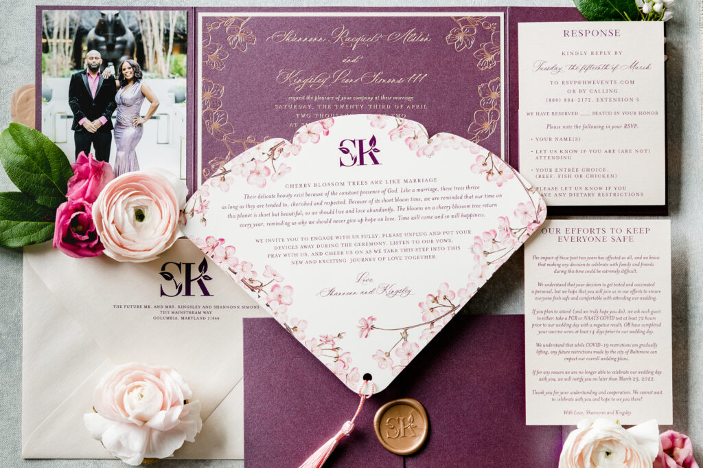 This gorgeous wedding at the Sagamore Pendry Baltimore hotel unfolded like a love letter to new beginnings. Inspired by the fleeting beauty and symbolism of Japanese cherry blossoms, their wedding design told a story of renewal, hope, and commitment. That story began the moment guests opened their wedding invitations. The couple commissioned LePenn Designs to create exquisite custom stationery that featured their engagement photo and delicate cherry blossom motifs. It offered guests a striking first glimpse into the elevated and thoughtful design that awaited them in Baltimore.