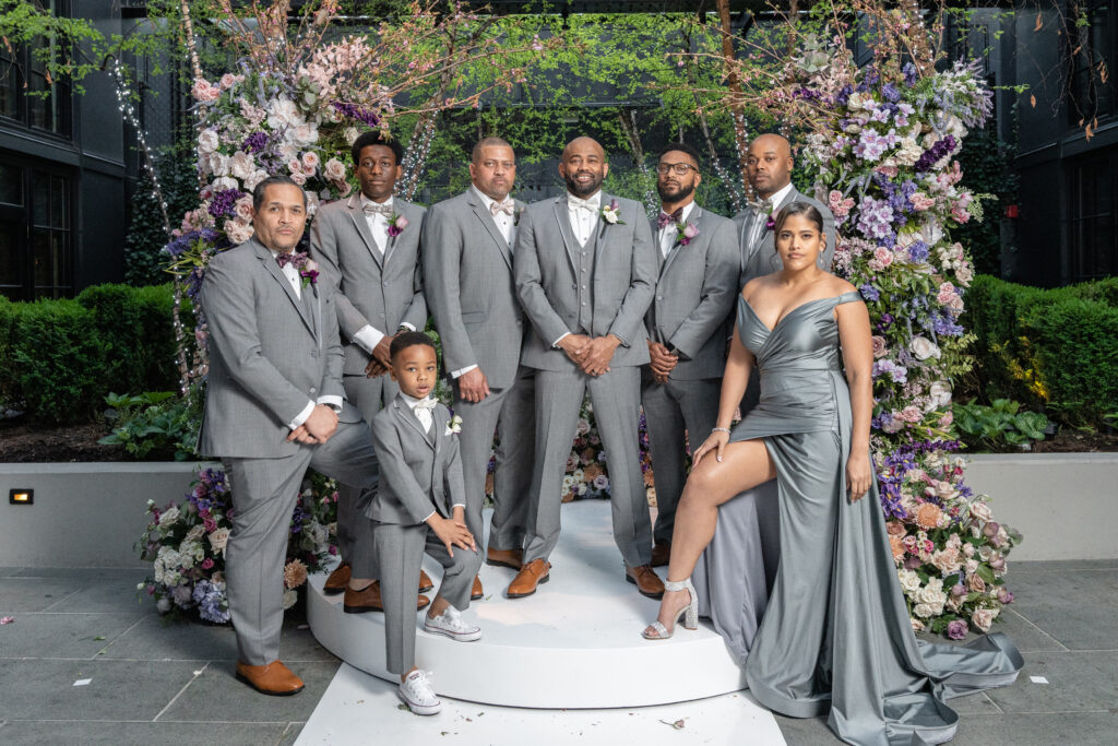 Their wedding party was nothing short of stunning, and most importantly, deeply loving and supportive. The bridesmaids glowed in an array of pink, purple and wine-colored gowns that felt soft, modern, and effortlessly chic. Each look complemented the overall design while allowing individual style to shine. The groomsmen brought both sophistication and heart to the celebration, including the groom’s sister, who proudly stood by his side in a sexy, tailored version of the groomsmen’s attire. Her presence beautifully reflected the couple’s inclusive, authentic approach to love and family.